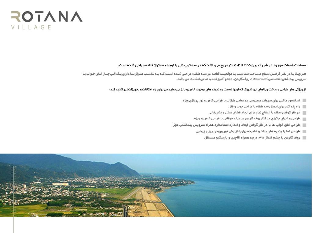 قطعات ۳۲۵ تا ۵۰۲ متری در سه تیپ اصلی، ویلاهایی با یک تا چهار سوئیت مستر، روفگاردنهای سبز، اسپا و تراسهای بزرگ رو به طبیعت را در خود جای دادهاند. زیرساختهای پروژه کاملاً اجرا شده و خدمات بهرهبرداری بهصورت تماموقت ارائه میشود.